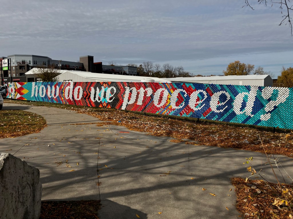 Public art recently installed near the river trail. The art is gone but the poem remains. For more info: https://iowacitypoetry.com/events/poetry-infrastructure/how-do-we-proceed