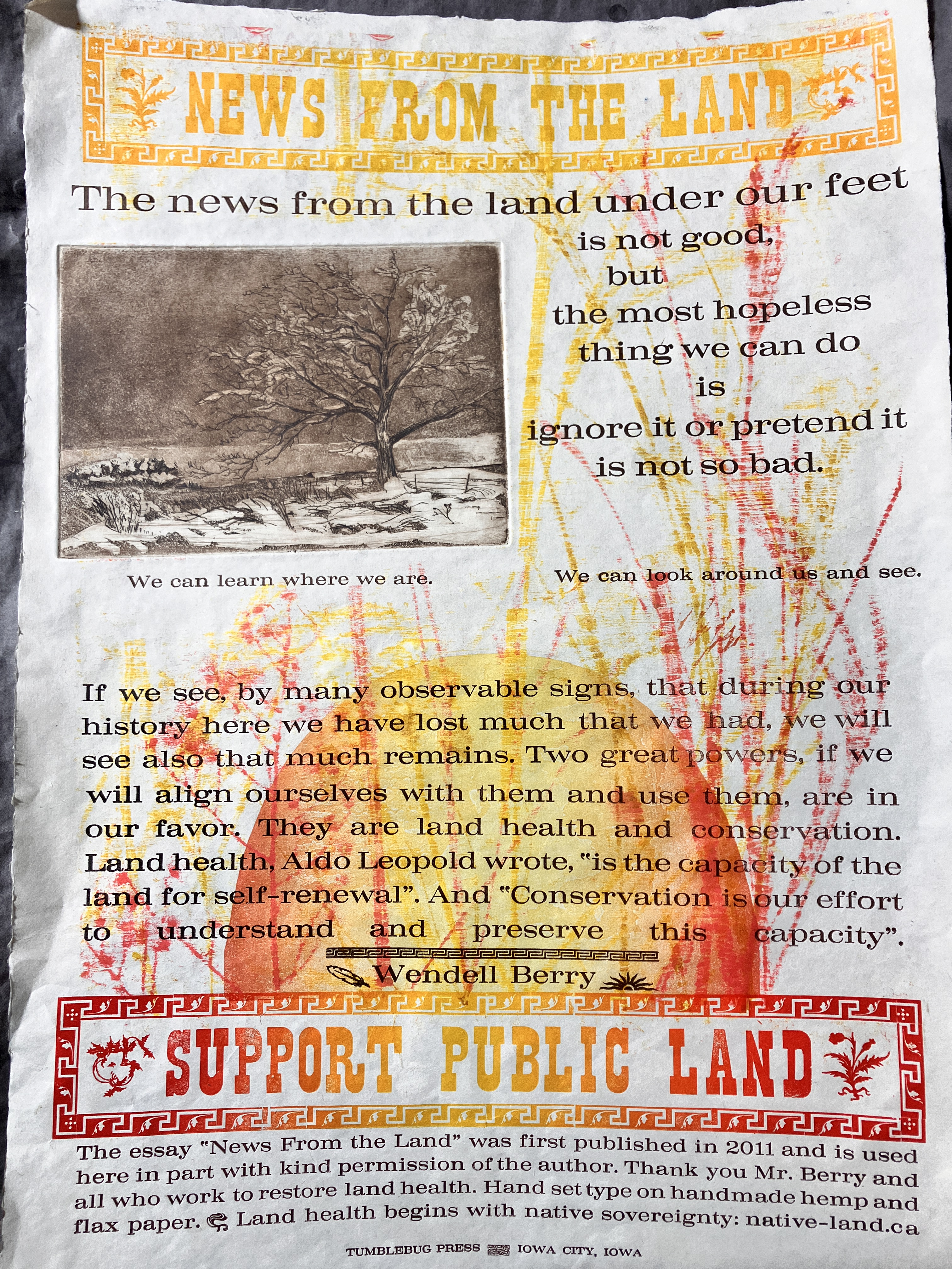 “The News From the Land” by Wendell Berry first appeared as the foreword to Kentucky’s Natural Heritage: An Illustrated Guide to Biodiveristy published in 2010. It was published as its own essay in The Progressive in 2011, vol. 74 no. 12.