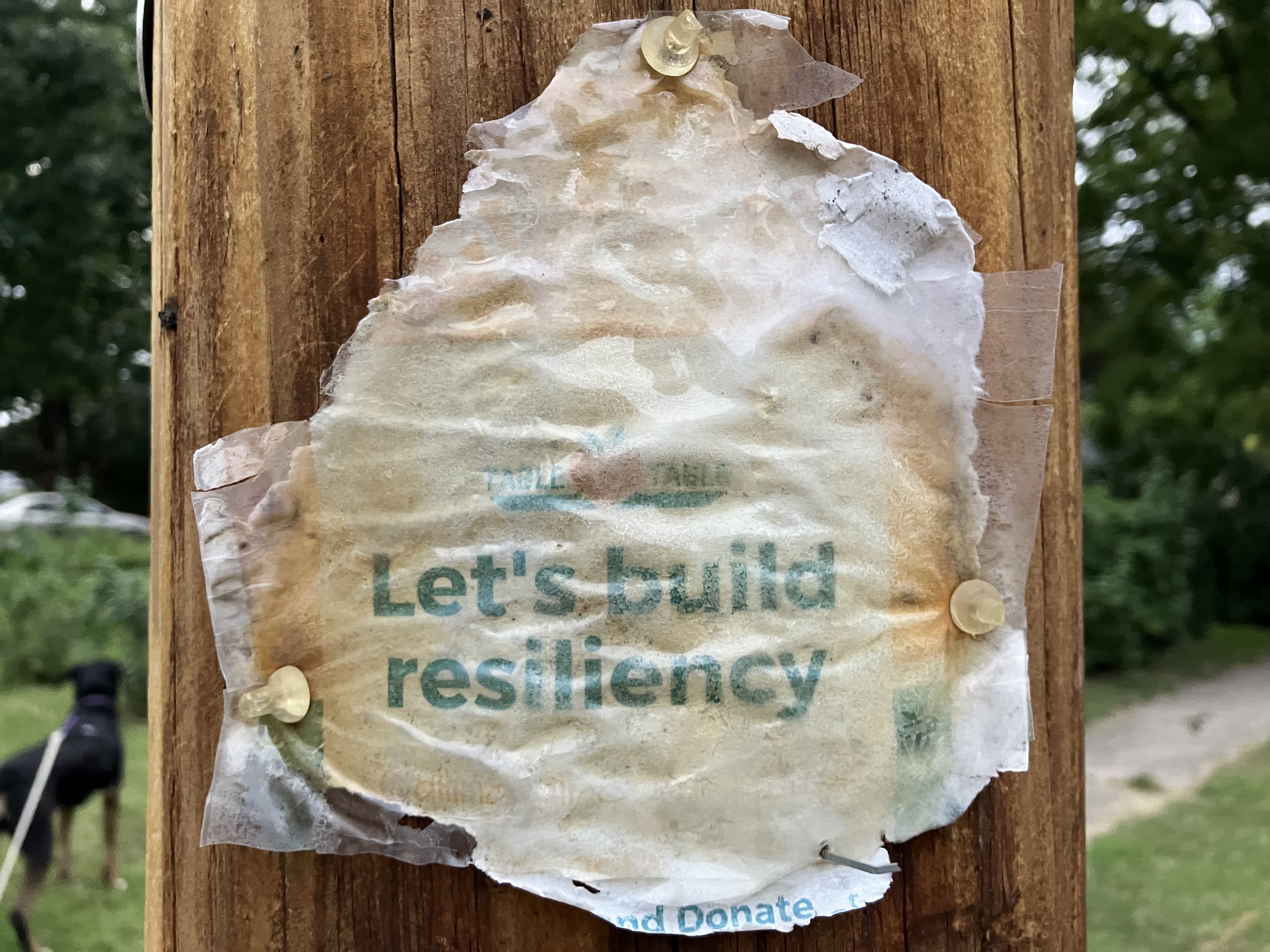This weathered post (Let’s Build Resiliency for the local food rescue-distribution group called Table to Table) was not printed by Tumblebug Press but I thought it’s appearance and message fits with Tumblebug’s philosophy. Support your local food rescue-distribution organization!
