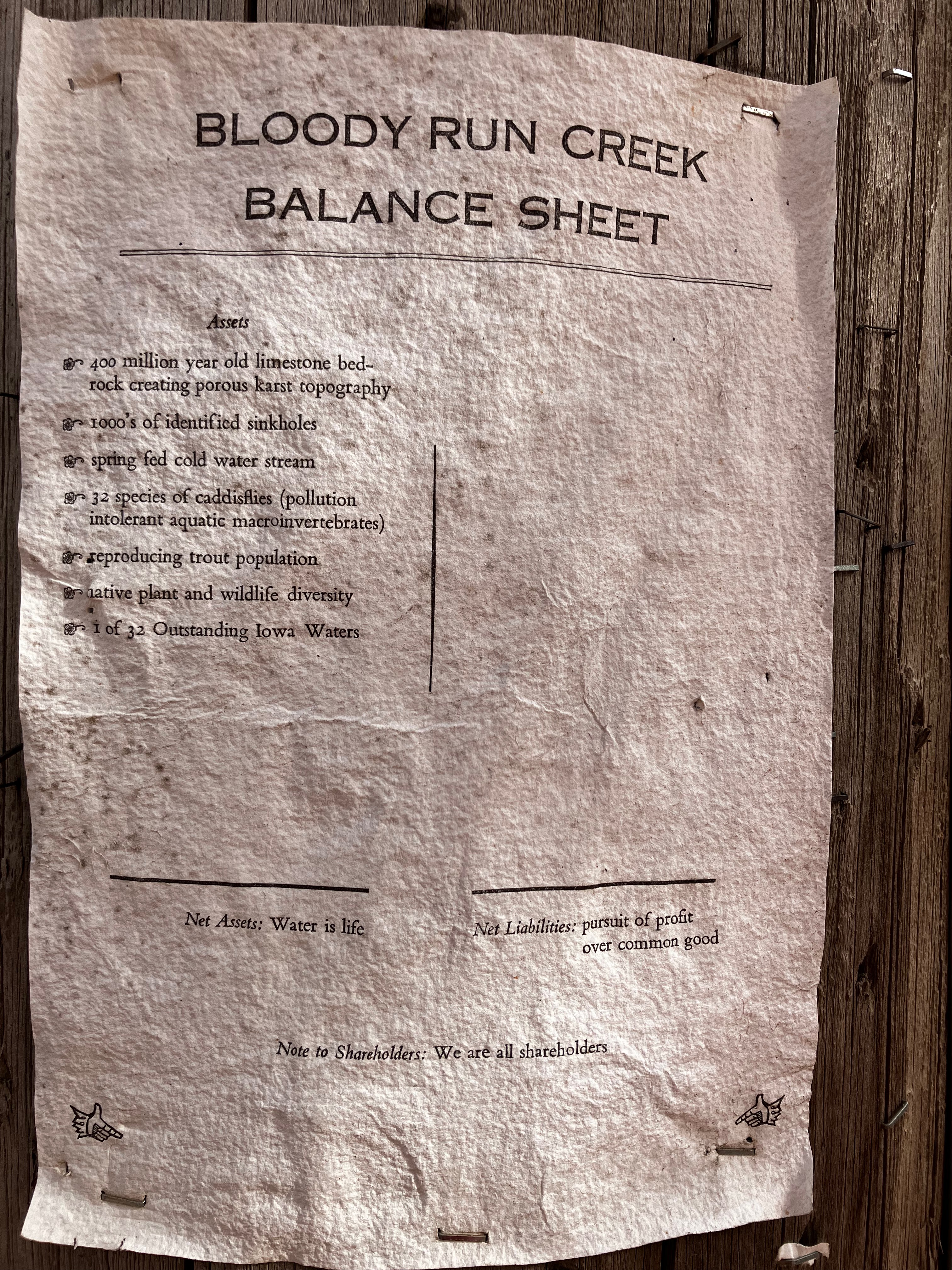 This was the first “published” piece of Tumble Bug Press in October of 2021. Bloody Run is a cold water spring fed trout stream in northeast Iowa near McGregor. True to Iowa’s legacy of being the lapdog of the Farm Bureau, Iowa’s Department of Natural Resources (DNR) is considering allowing a confined animal feeding operation in the very karst topography that drains into the headwaters of Bloody Run Creek. The Sierra Club of Iowa is suing Iowa’s DNR for accepting faulty data in its decision process. Please read more and support https://savebloodyrun.org/ .